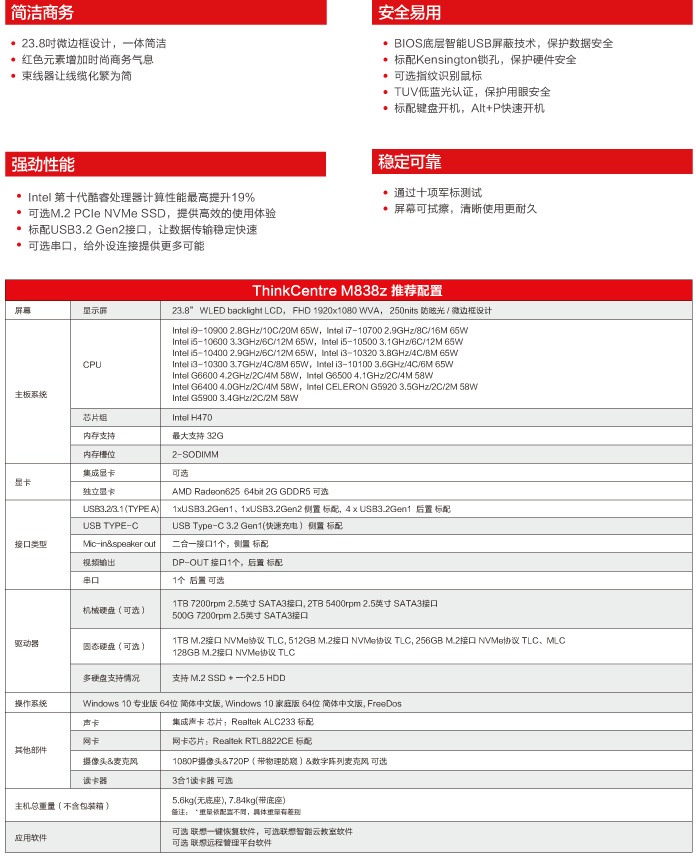 名稱 | 聯(lián)想Thinkcentre M838z-D096 商用一體電腦(I5-10500/8G/1T機(jī)械硬盤/集成/內(nèi)置揚(yáng)聲器/23.8寸全高清LED/USB鍵盤鼠標(biāo)/三年保修上門服務(wù)/聯(lián)想一鍵復(fù)原/win10 Home) |