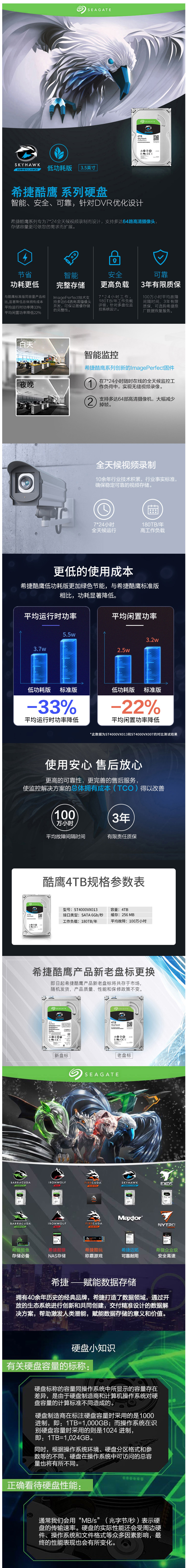希捷ST4000VX013監控硬盤4TB 256MB SATA 希捷酷鷹SkyHawk 低功耗版×單位:個