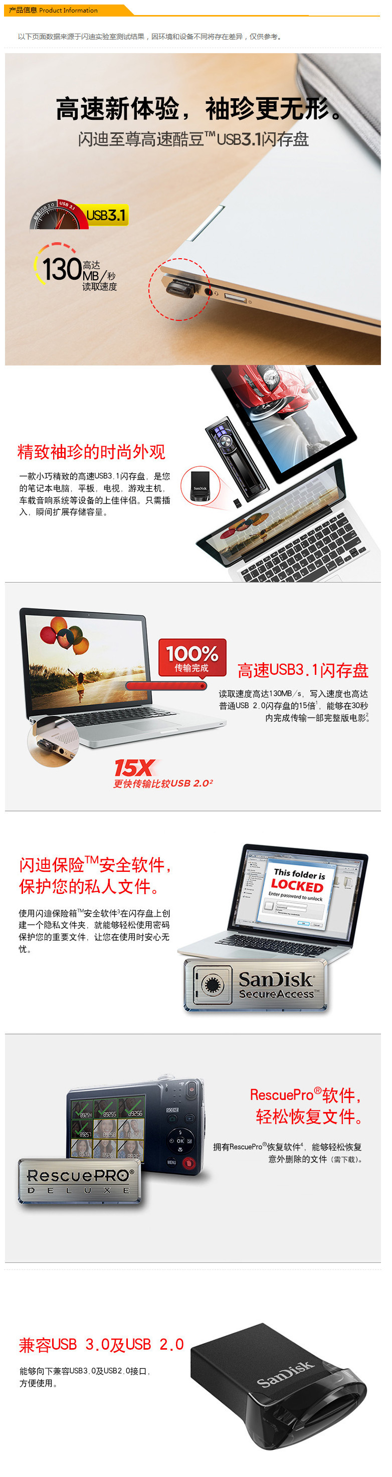 閃迪 USB3.1 U盤 CZ430酷豆 黑色 讀速130MB/s 車載U盤 小身材 大容量×128G