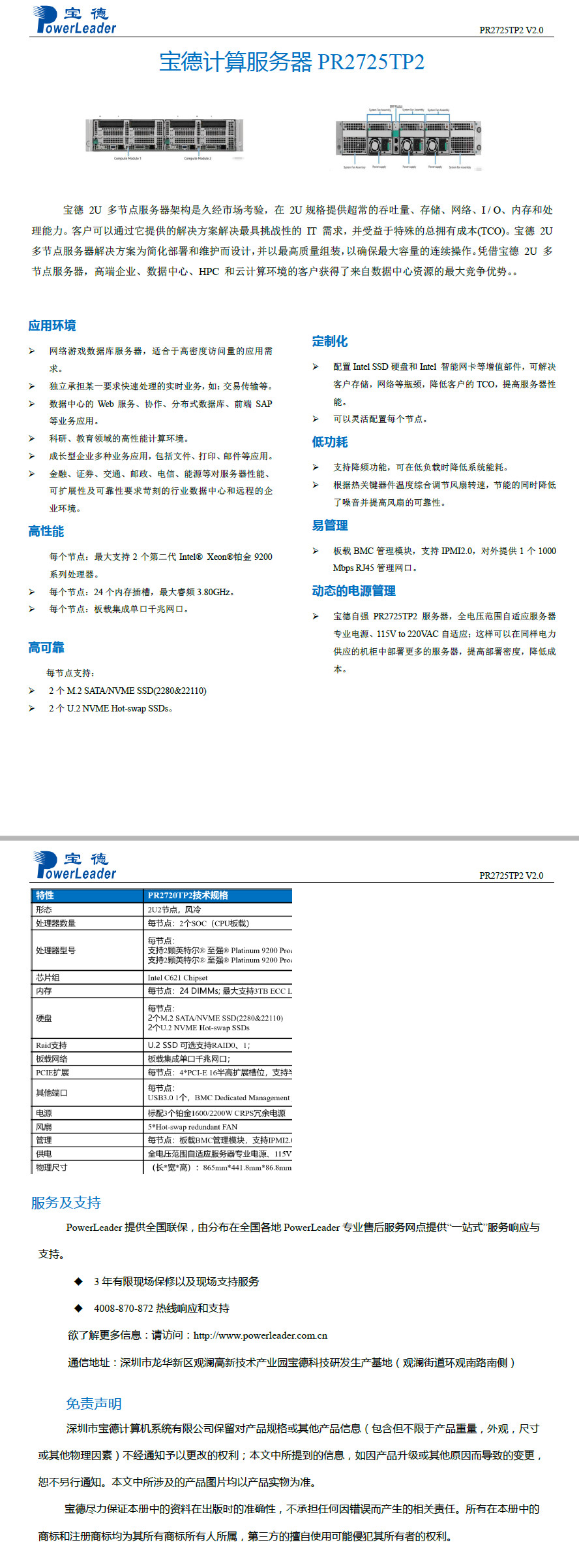寶德PR2725TP 2U機架式計算服務器(計算節點*2/集成至強鉑金9200*2/至強9248*4/16GB內存*48/240GBSSD*3/導軌/1600W鉑金電源*3/三年免費保修)×單位:臺
