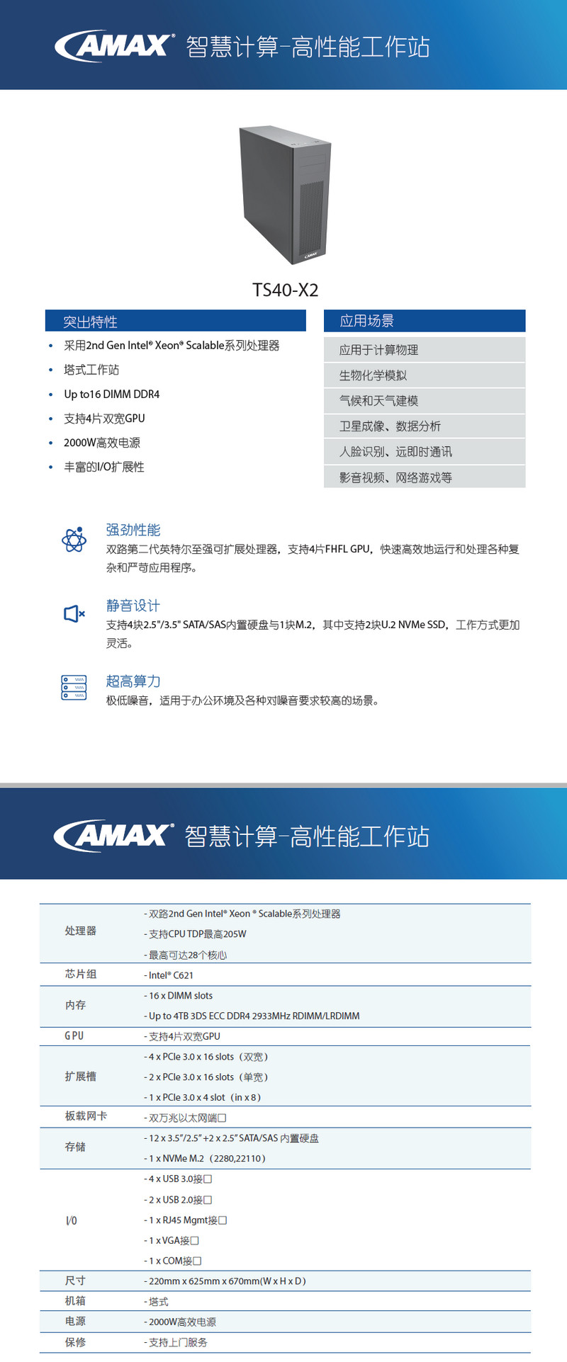 AMAX TS40-X2 GPU塔式工作站(金牌6242*2/32GB內(nèi)存*8/960GBSSD硬盤*2+6TB企業(yè)級機械硬盤*3/NVIDIATITANRTX24GBGDDR6*2/2000W電源)×單位:臺