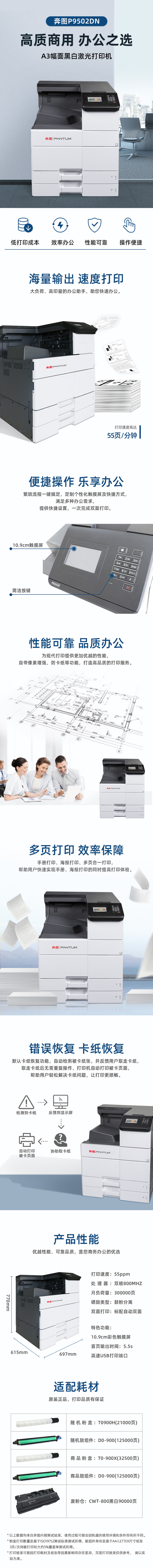 奔圖(PANTUM) P9502DN黑白A3激光打印機(jī)(55頁(yè)每分鐘/雙面打印/A3打印/USB打印/網(wǎng)絡(luò)打印/可加大容量紙盒)