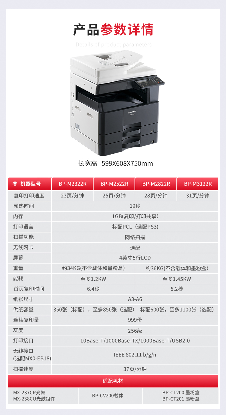 規格 | BP-M2522R 黑白數碼復印機(主機/雙面送稿器/雙紙盒/工作臺) |