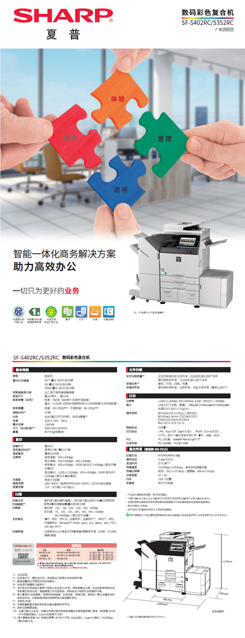 規格 | SF-S402RC 彩色復印機 (主機+雙面送稿器+雙紙盒帶落地原裝工作臺DE25N+無線wifi) |
