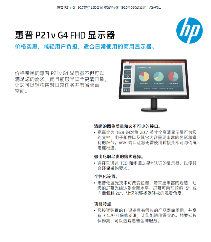 惠普(HP)P21v G4 20.7英寸 LED背光 液晶顯示器 1920*1080高清屏