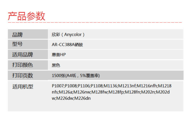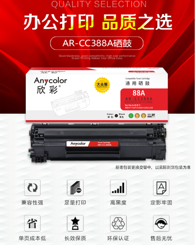 名稱 | 欣彩(Anycolor)CC388A硒鼓 大眾版 AR-CC388AS hp88A 適用惠普 P1007 P1008 P1106 P1108 M1136 M1213nf |