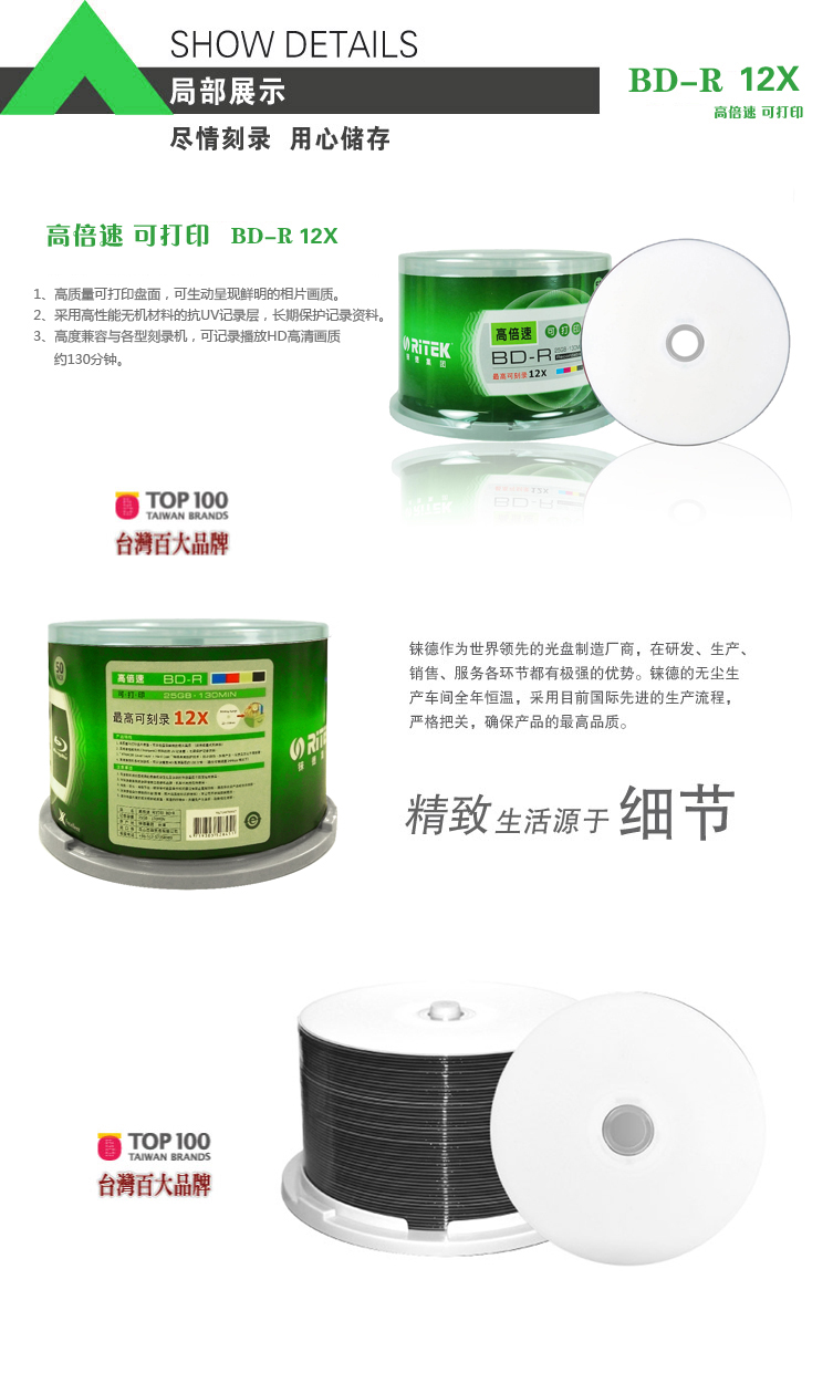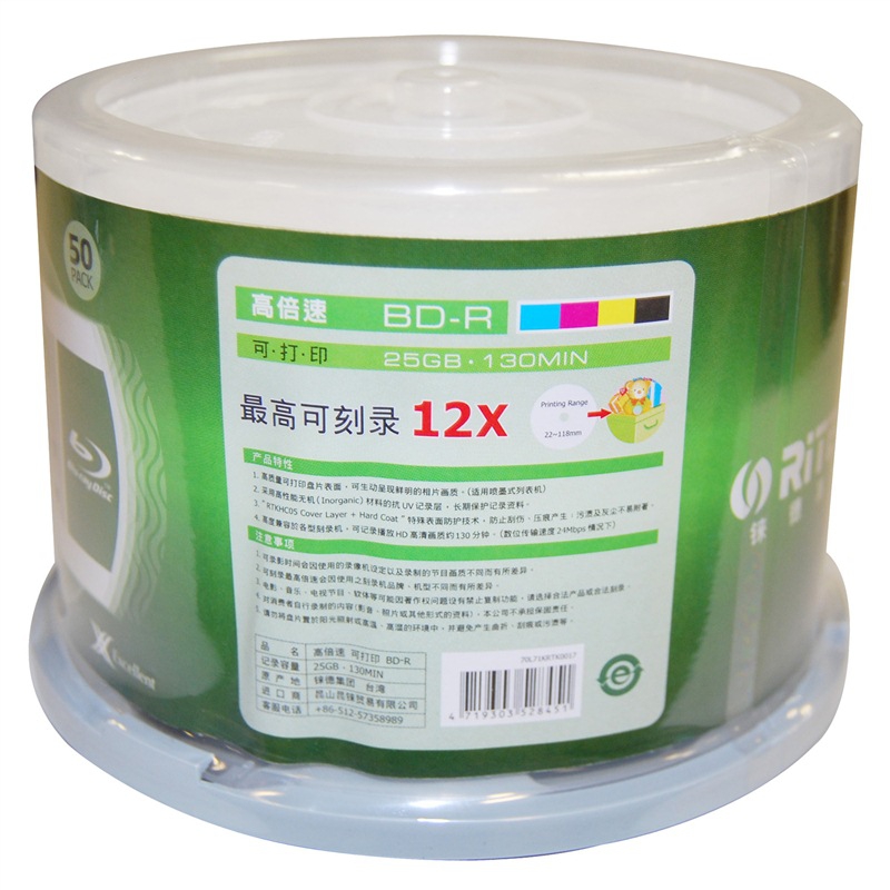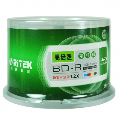 錸德(RITEK) 藍光可打印 BD-R 12速25G 空白光盤/光碟/刻錄盤/大容量 桶裝50片