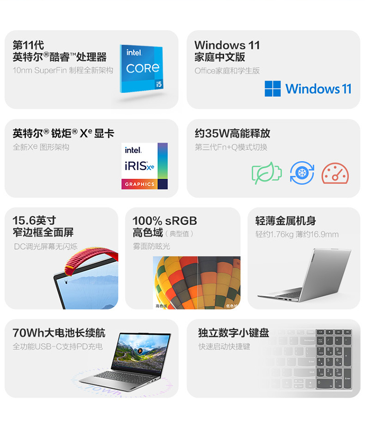 聯(lián)想(Lenovo) 小新Air15 15.6英寸 英特爾酷睿 全面屏超輕薄筆記本電腦 i5-1155G7 16G 512G 銳炬顯卡 高色域 獨(dú)立數(shù)字小鍵盤 銀色