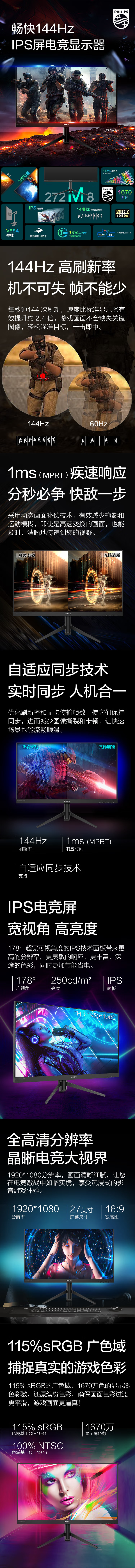 飛利浦 27英寸 IPS 144Hz 1ms 115%sRGB 可壁掛 HDMI&DP接口 電競顯示器 猛騰游戲顯示屏 272M8