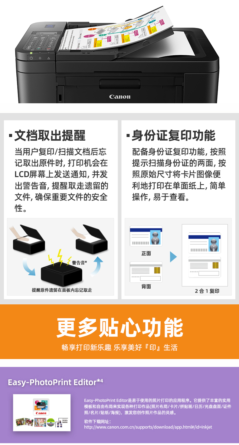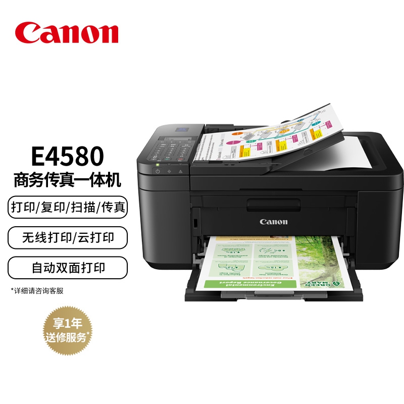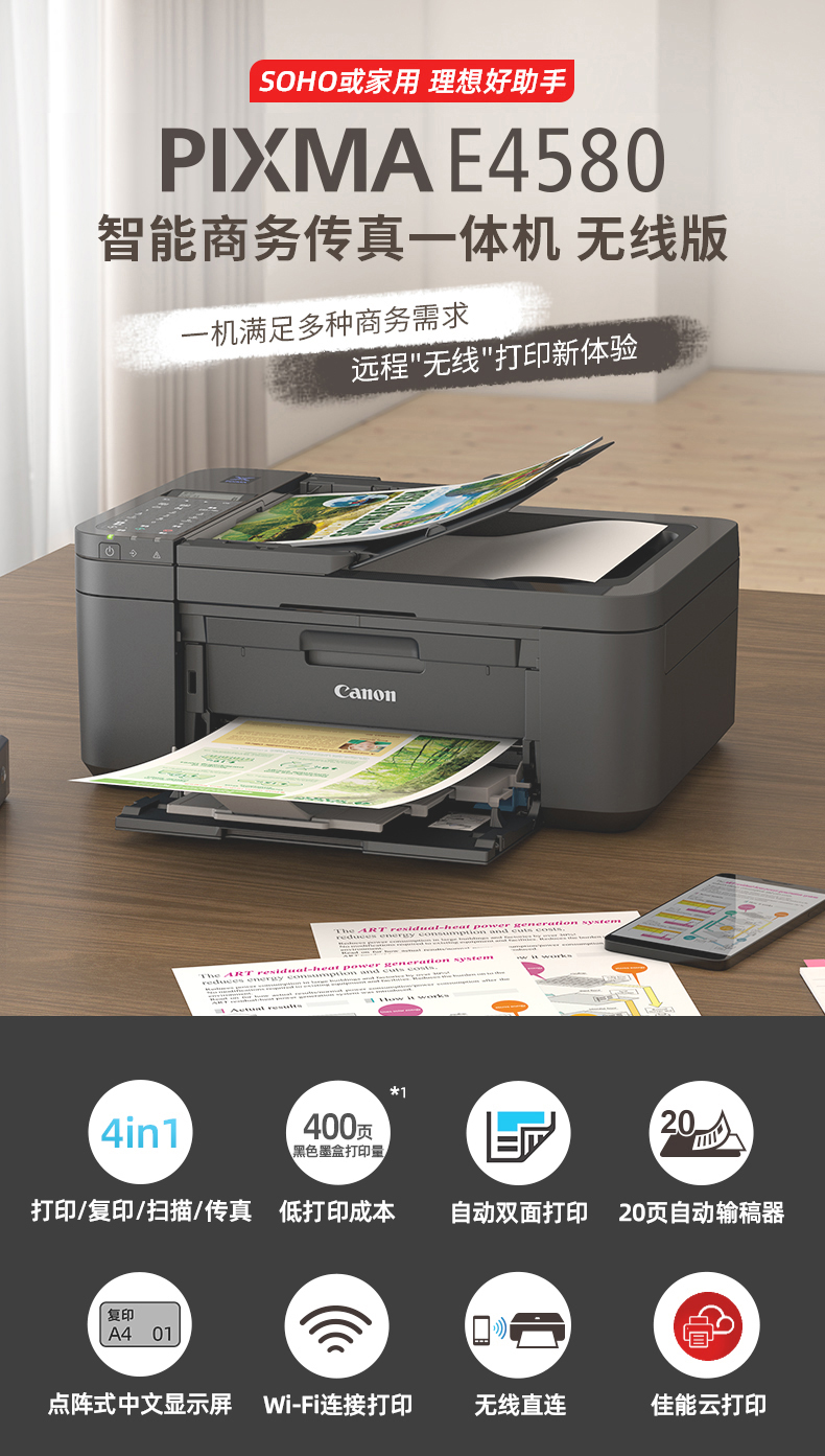 佳能(Canon)E4580無線智能商務傳真一體機(打印/復印/掃描/傳真 WiFi/微信遠程打印 家庭打印/商用辦公)