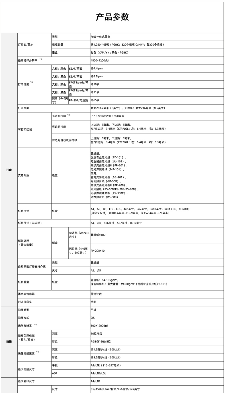 ①打印機×1 ②電源線×1 ③打印頭(彩色×1,黑色×1) ④墨水瓶(PGBK×1,C×1,M×1,Y×1) ⑤手冊、其他文檔×1 ⑥USB電纜線×1