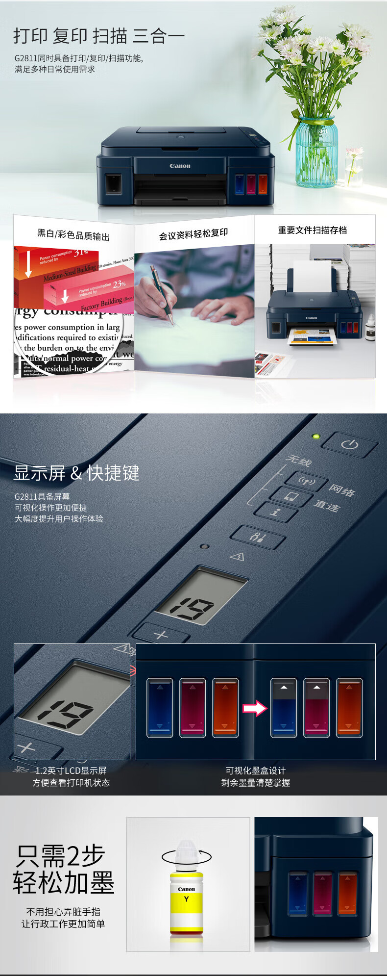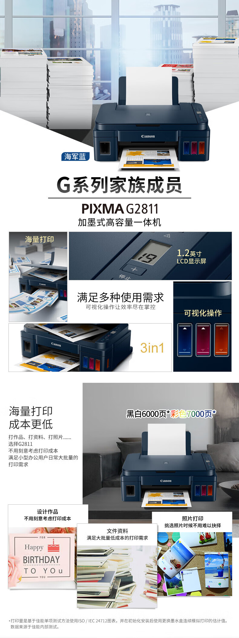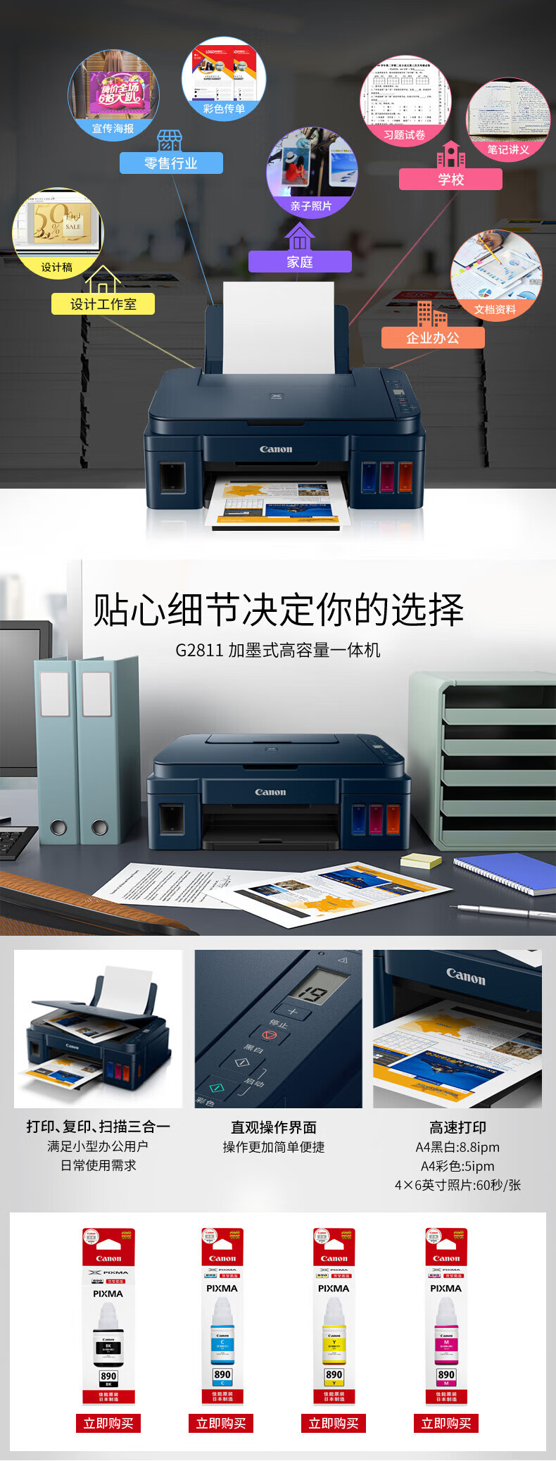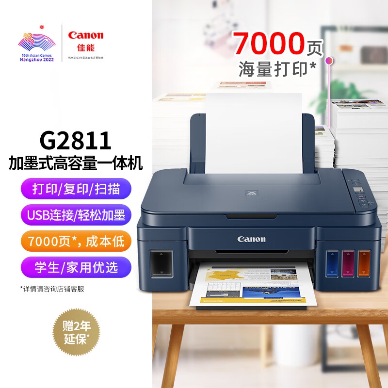 佳能(Canon)G2811大容量可加墨彩色多功能一體機(jī)(打印/復(fù)印/掃描/作業(yè)打印/照片打印機(jī) 學(xué)生/家用)