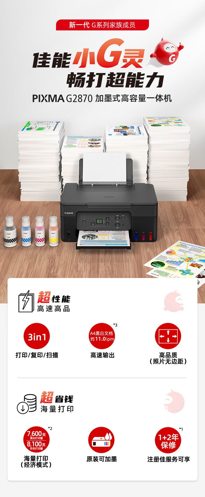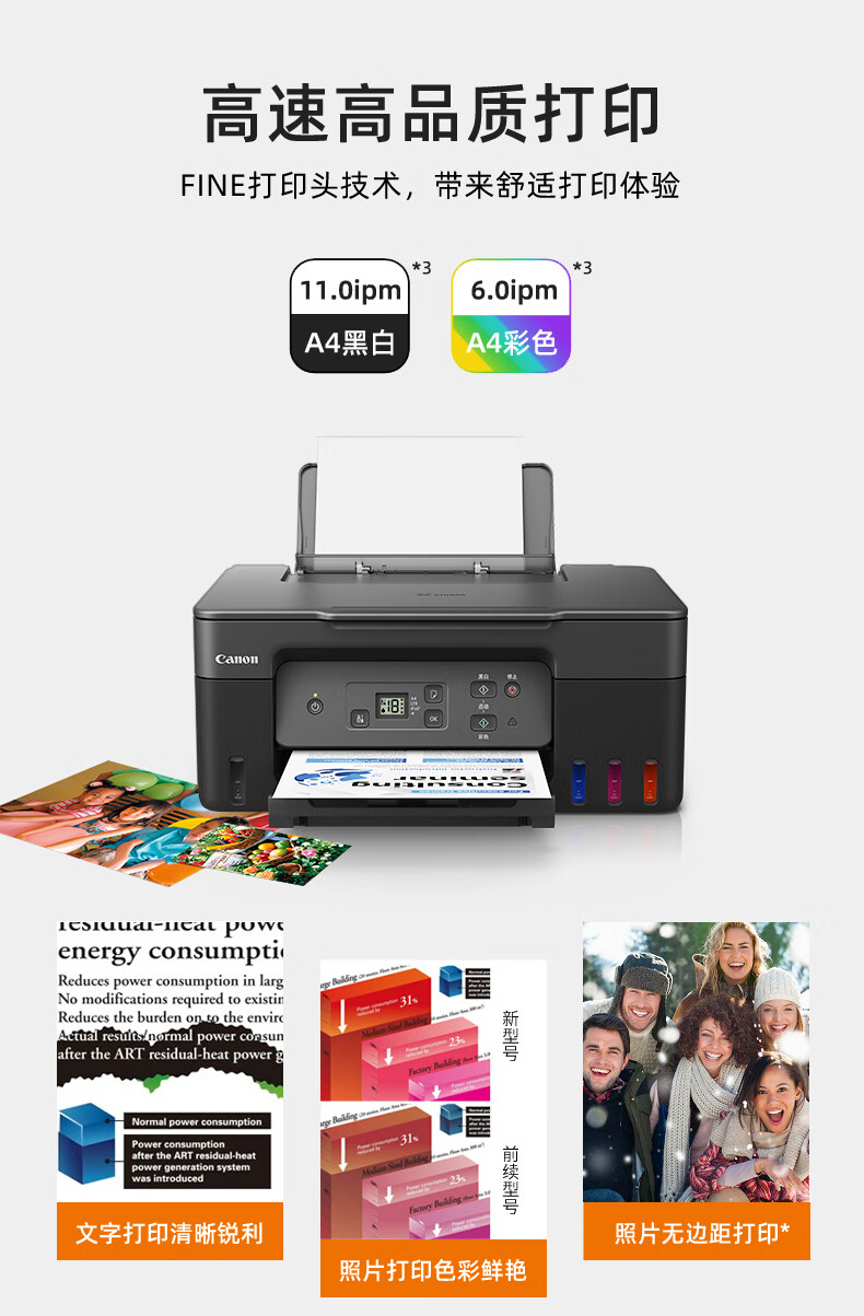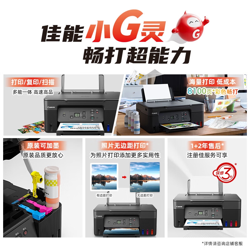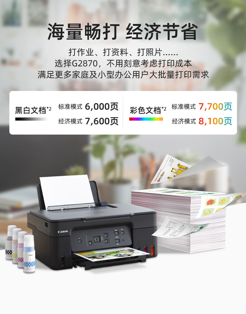 佳能(Canon)G2870大容量可加墨彩色多功能一體機(jī)(打印/復(fù)印/掃描/作業(yè)打印/照片打印機(jī) 學(xué)生/家用)
