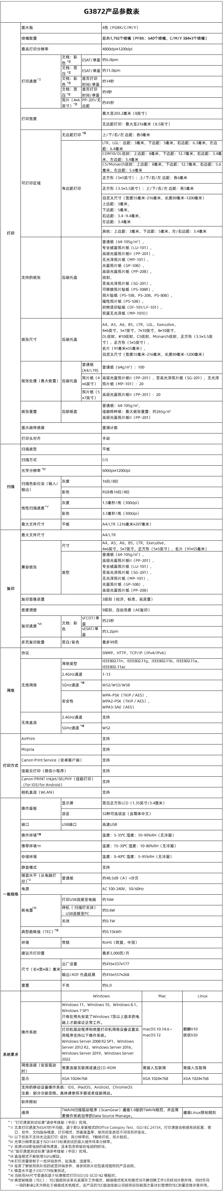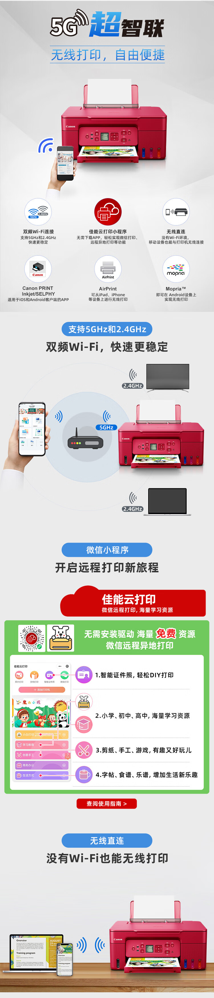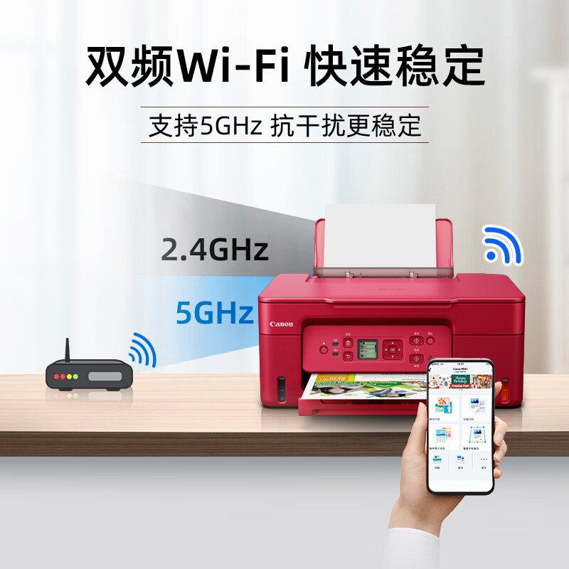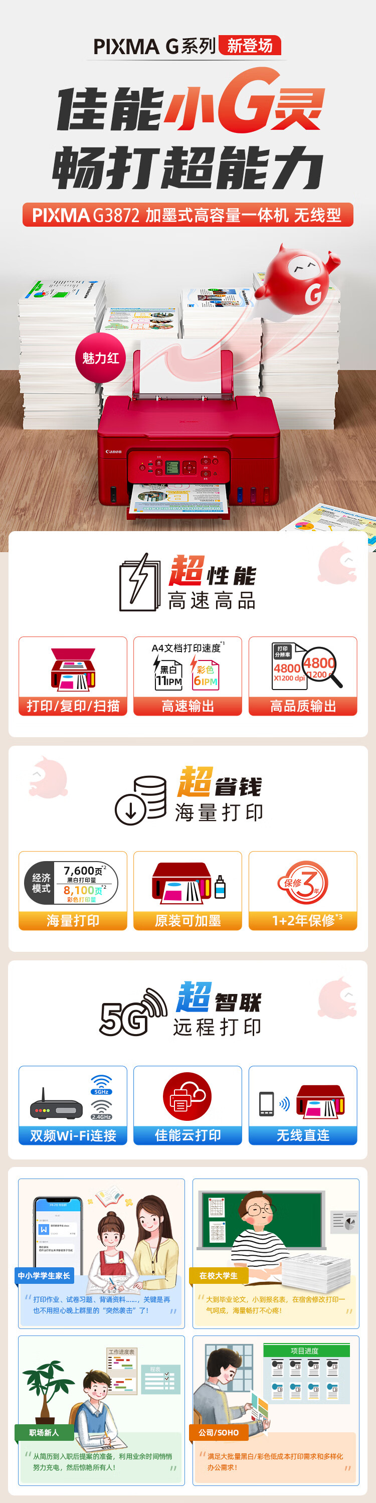 佳能(Canon)G3872大容量可加墨彩色多功能無線一體機(打印/復印/掃描/雙頻WiFi 支持5G 學生/家用)